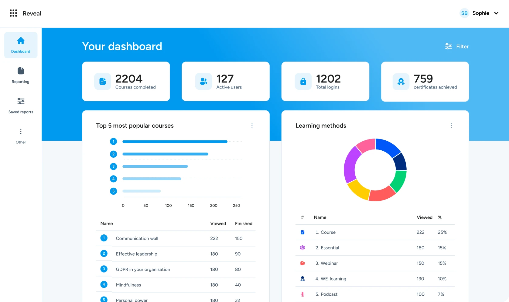 Het dashboard is het centrale punt van Reveal en geeft in één oogopslag inzicht in de leerstatus binnen jouw organisatie. Afhankelijk van je rol krijg je een gepersonaliseerd overzicht – van HR-directeur tot teammanager.